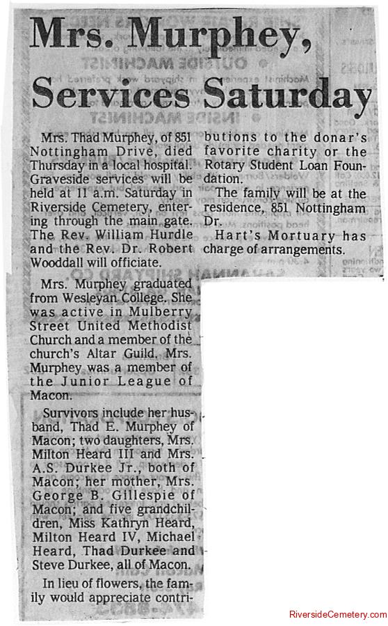 Daughters: Mrs. Milton Heard III, Mrs. A. S. Durkee, Jr. Mother: Mrs. George B. Gillespie Grandchildren: Kathryn Heard, Milton Heard IV, Michael Heard, Thad Durkee, Steve Durkee