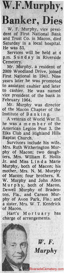 Daughters: Mrs. William E. Hollis, Jr., Linda Marie Murphy Mother: Mrs. N. M. Murphy Brothers: R. W. Murphy, John Allen Murphy, Dewell Murphy, Carson Murphy Sister: Mrs. W. T. Kendrick