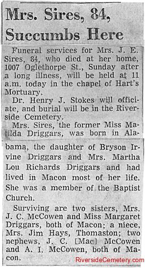 Sisters: Mrs. J. C. McCowen, Margaret Driggars Niece: Mrs. Jim Hays Nephews: J. C. (Mac) McCowen, A. L. McCowen