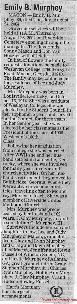Son: Julian C. Murphey III Daughter-in-law Lee and Judy Murphey Grandchildren: Clay Murphey, Lynn Murphey, Jennifer Fussell, Kevin Fussell, Leslie Murphey Great Grandchildren: Craig Stephen Murphey Jr., Charles Ryan Murphey, Hollis Ann Murphey, J. Clay Murphey V, Hudson Rowley Fussell