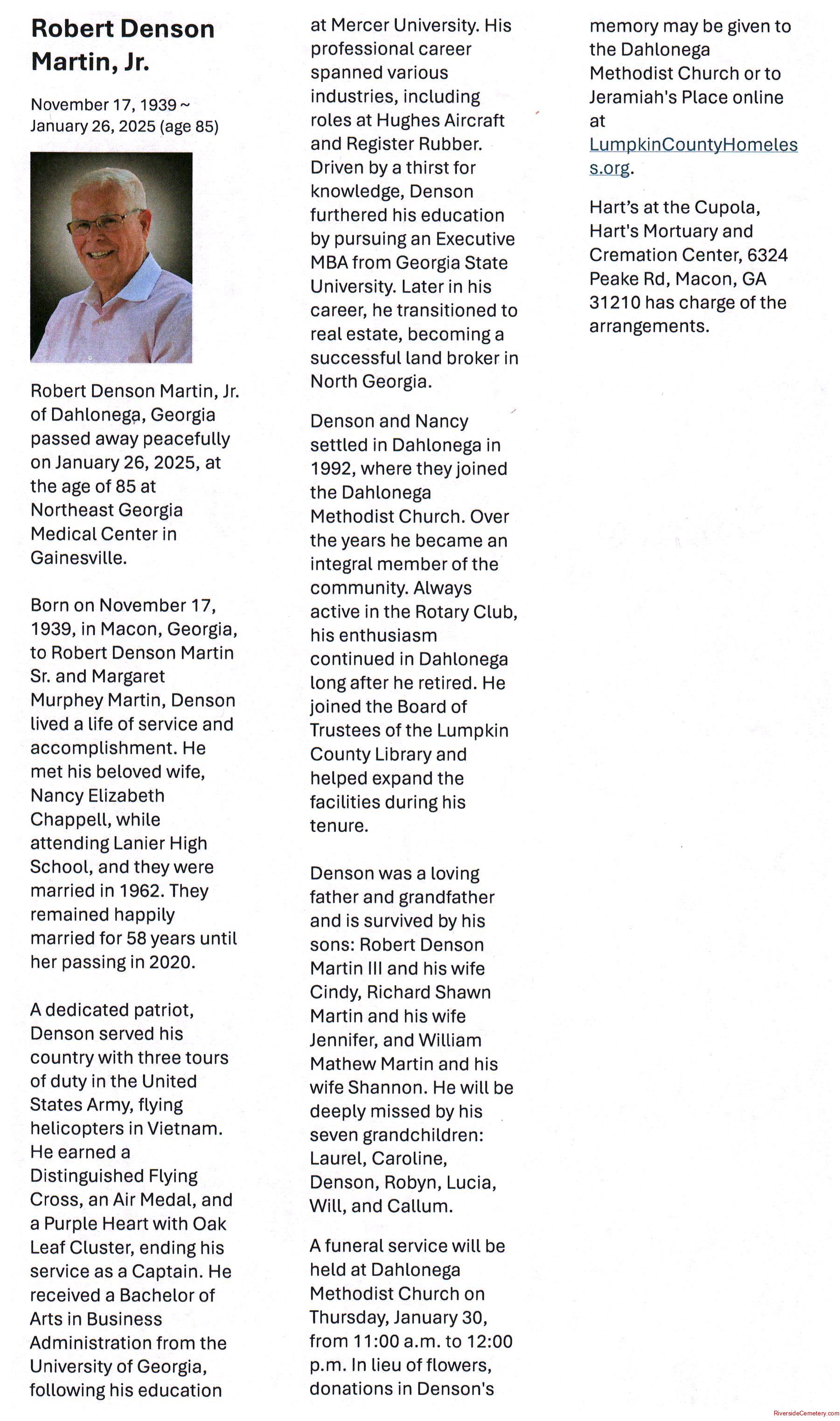 Sons: Robert Denson Martin III (Cindy), Richard Shawn Martin (Jennifer), William Mathew Martin (Shannon) Grandchildren: Laurel, Caroline, Denson, Robyn, Luciaa, Will, Callum