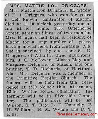 Son: S. D. Driggars Daughters: Mrs. J. C. McCowen, May Driggars, Margaret Driggars Brother: T. D. Richards