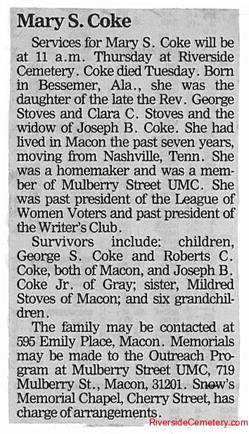 Sons: George S. Coke, Roberts C. Coke, Joseph B. Coke, Jr. Sister: Mildred Stoves