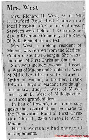 Sons: Russell B. West, Stephen J. West Sister: Jane L. Smith Brother: Frank Edward Lloyd Daughters-in-law: Judy S. West, Lynn B. West