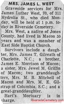 Daughter: Mrs. James T. Gilreath Brother: James E. Morrison Sister: Jewel M. Griffin Granddaughters: Mrs. M. B. Mitchell, Mrs. M. E. Gilstrap